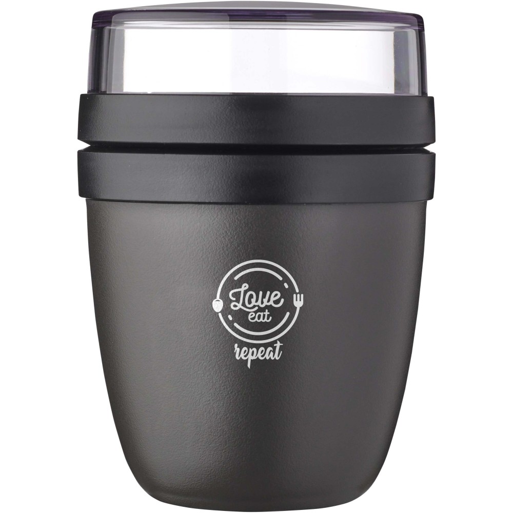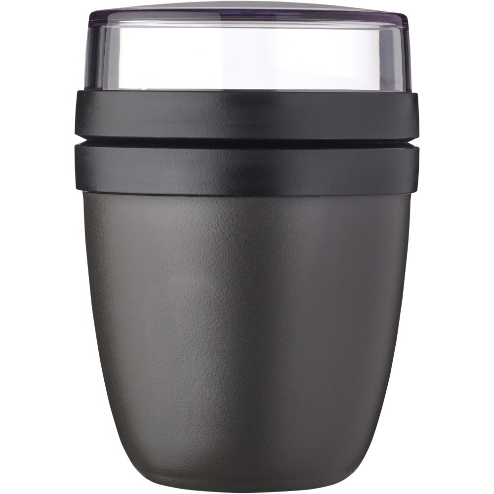 Az Ellipse Mini ételdoboz tökéletes különféle snackekhez, például joghurthoz müzlivel vagy leveshez krutonnal. Két praktikus rekesszel rendelkezik egy strapabíró tartályban, így az összetevőket szépen elkülönítheti egymástól. Kompakt mérete miatt ideális iskolatáskába való elhelyezésre, így gyors és kényelmes étkezést biztosít. A felső átlátszó tartály 120 ml-es, ideális körülbelül 50 gramm müzli vagy gyümölcs tárolására, az alsó tartály pedig 300 ml-es. Szivárgásmentes és mosogatógépben mosható. BPA-mentes.