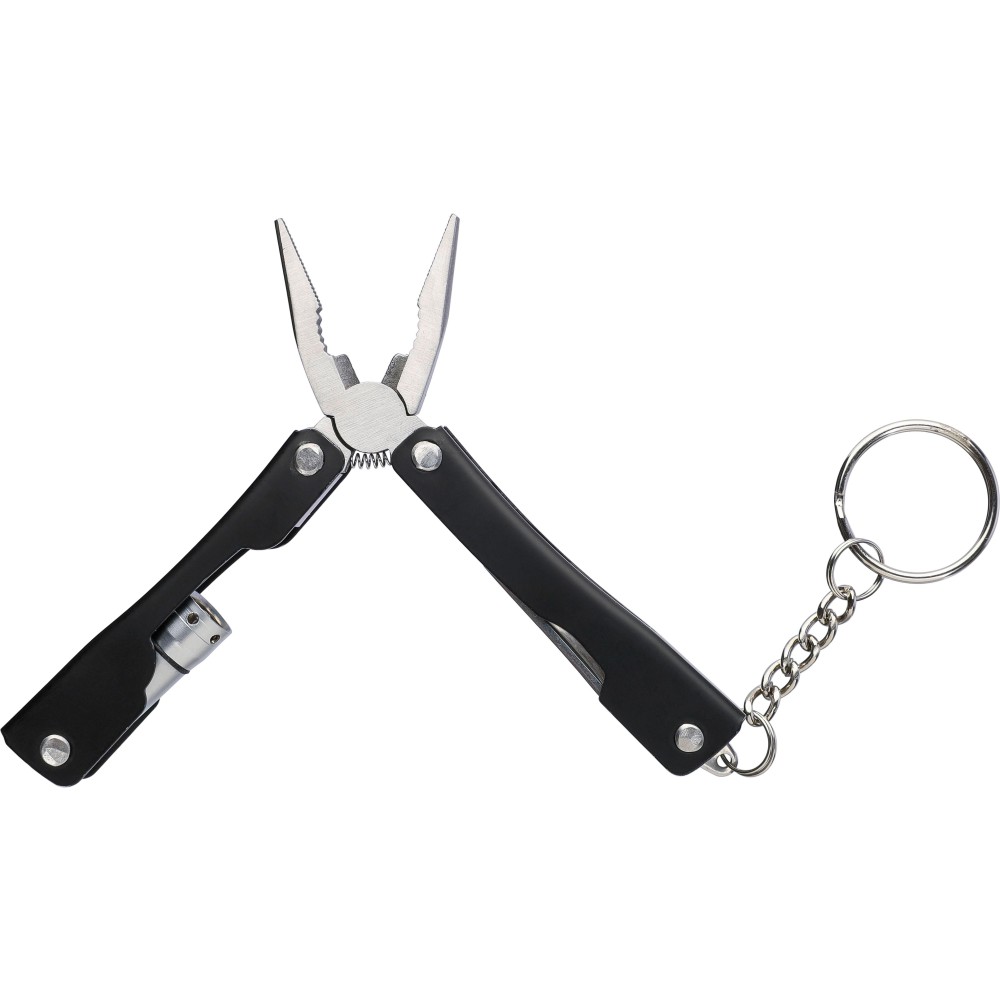 Összecsukható multifunkciós szerszám 10 funkcióval és LED zseblámpával. 600D poliészter tokban, tépőzáras záródással. A tok övre rögzíthető. Tartalmazza az elemeket. Egyenként barna kartondobozba csomagolva. Anyaga: rozsdamentes acél.